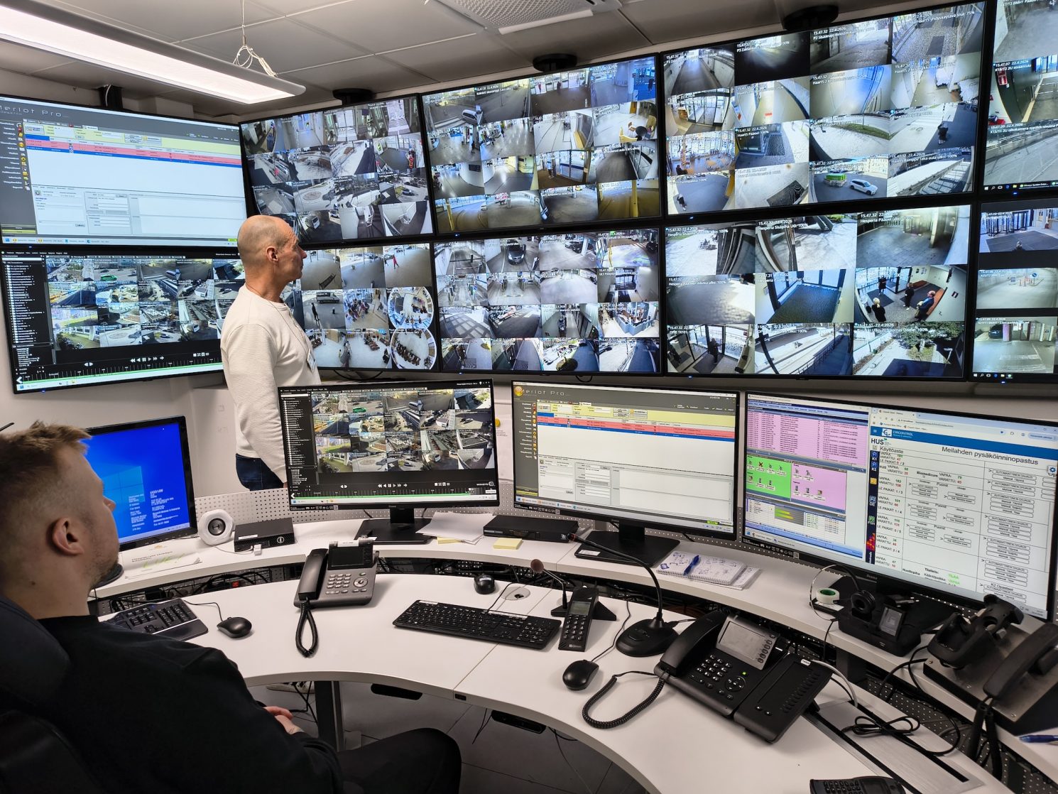 ”Turvavalvomo on asiakkaillemme ensisijainen yhteydenottopaikka kaikissa turvallisuuteen liittyvissä asioissa. Valvomosta käsin saamme nopeasti lähimpänä olevan vartijan tai partion kohteeseen. Vartijat ovat jatkuvasti yhteydessä toisiinsa eri viestivälineiden avulla ja jokaisessa vuorossa on vuorovastaava, joka toimii vuoronsa aikana kenttäjohtajana”, Kaarla kuvailee.